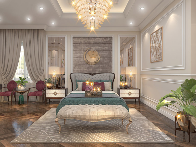 Nội thất biệt phong cách cổ điển luôn được chăm chút tỉ mỉ, từ vật liệu đến từng chi tiết nhỏ. Mỗi món đồ nội thất trong không gian sống đều được lựa chọn kỹ càng, mang đến sự hòa hợp tuyệt đối đối với tổng thể kiến trúc. Bộ sofa bọc nhung sang trọng, bàn ăn gỗ quý được chạm khắc phu, kệ tivi cổ điển hay chùm đèn chùm pha lê trốn luôn là những điểm nhấn không thể thiếu
