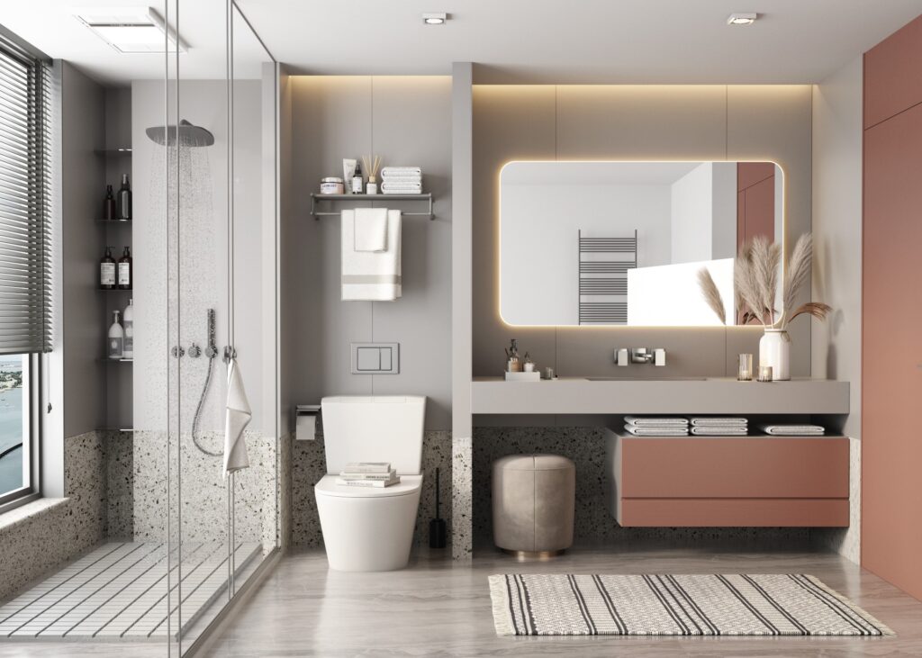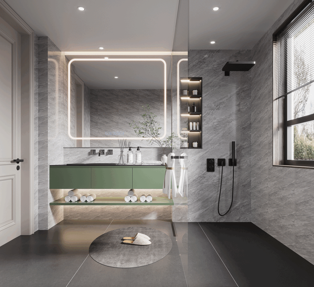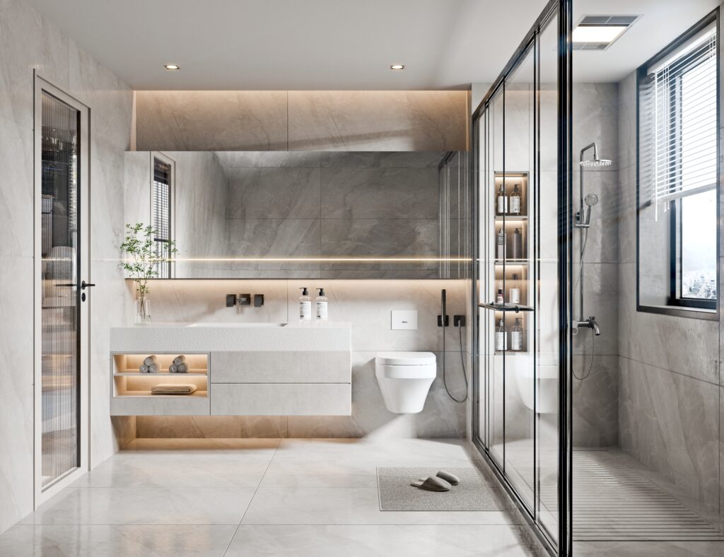 - Hệ thống chiếu sáng: Kết hợp ánh sáng tự nhiên và nhân tạo, đèn LED âm trần hoặc đèn gương giúp không gian sáng sủa, sang trọng.