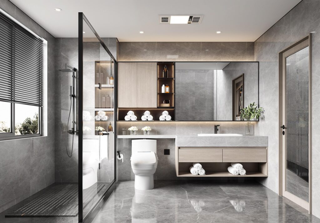 - Hệ thống chiếu sáng: Kết hợp ánh sáng tự nhiên và nhân tạo, đèn LED âm trần hoặc đèn gương giúp không gian sáng sủa, sang trọng.