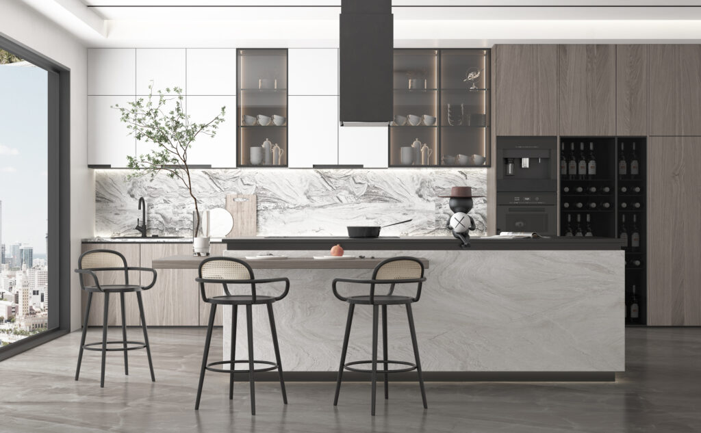- Chất liệu gỗ, inox, đá: Độ bền cao, dễ vệ sinh và mang lại vẻ sang trọng.